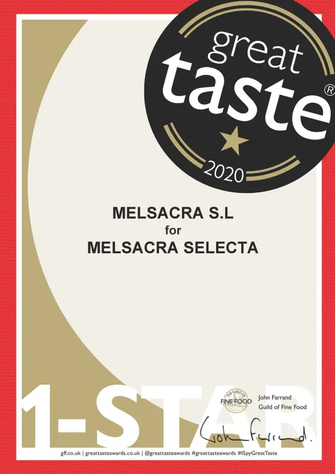 El prestigioso concurso GREAT TASTE AWARDS, organizado por el Gremio Británico de la Buena Comida (The Guild of Fine Food), nos obsequio, en la edición 2020, la prestigiosa etiqueta Great Taste, con 1 estrella, para la variedad Melsacra Selecta.